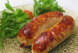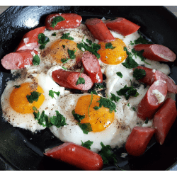 Яєчня смажена з гуцульським копченим салом і копченими мисливськими сосисками.