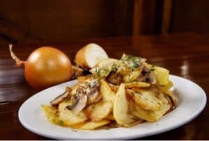 Лоці - блюдо угорської кухні, але закарпатці додали свого у його приготування. Основа лоці - свинина, у нашому випадку - свинні стейки. Найбільша відмінність від подібних страв зі стейками - велика кількість цибулі. Увага! Вагове блюдо!